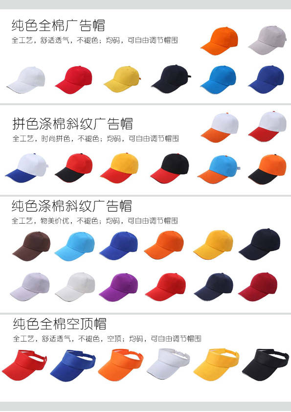 廣告帽作為一種現(xiàn)代新穎廣告載體,具有流動性大、色彩鮮艷和良好的視覺效果,其圖案設計不受限制、結構可任意選擇以及美觀耐用、質優(yōu)價惠等多種優(yōu)點,成為企業(yè)廣告宣傳的一種重要形式,廣告帽具有其它形式廣告不可比擬的優(yōu)勢。廣告帽優(yōu)勢:1﹑流動性大:廣告帽具有走到哪里,廣告就做到哪里的優(yōu)點;2﹑物美價廉:廣告帽具有廣告投入成本低,制造過程快,消費者印象深等優(yōu)點;3﹑實際用途廣:廣告帽具有陰天遮風,晴天遮陽的功能,是男女老少不可少的一種日常生活用品;4﹑廣告時間長:廣告帽的使用壽命長,可對企業(yè)進行長期的廣告宣傳,是一種可靠的廣告方式。廣告帽訂制,可以把您的創(chuàng)意,圖案印制到帽面上,可印前面、后面、側面,圖像逼真清晰,是佳節(jié)慶典、廣告促銷之最佳禮品。